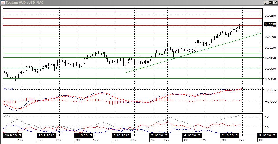 На четырёхчасовом графике пара растёт, рост усиливается, что видно по увеличению превышения DM+ над DM- при росте ADX, и так находящегося на высоком уровне. Существенных коррекций вниз не происходит, это также показывает силу тенденции и отсутствие поддержки для снижения. Пара приблизилась к уровню сопротивления 0,7200 — это «круглое» значение и уровень относительного максимума 116-17 сентября. Скорее, рост пары продолжится до относительного максимума сентября, так как признаков для разворота не видно.