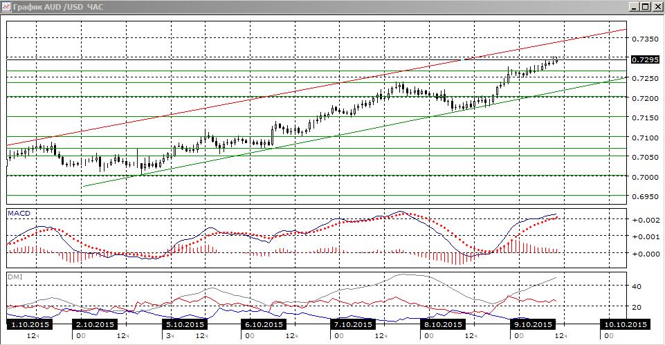 На часовом графике пара достигла уровня 0,7300. Возможно, «круглый» уровень приведёт к коррекции, так как динамика пары ослабла, образовались свечи «дожи». В целом рост видится предпочтительным, и выше 0,7300 стоит на него рассчитывать. В случае коррекции ближайшей поддержкой для пары видится 0,7260, далее — 0,7235, около максимума 7 октября.
