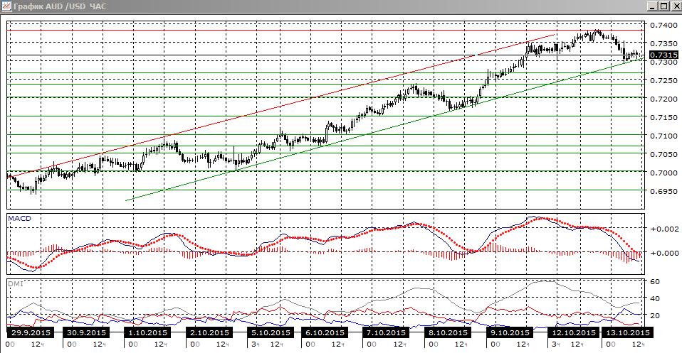 На часовом графике уровень 0,7300 выступил уже в роли поддержки для пары. Так как примерно там находилась и нижняя граница канала, то это усиливает поддержку здесь. И на часовом, и на четырёхчасовом графиках имеет медвежье расхождения максимумов пары и гистограммы MACD. Если пара всё-таки снизится ниже линии тренда, то учитывая расхождение снижение может стать более существенным, и поддержкой в этом случае будет уровень 0,7200.