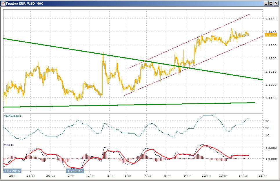 После выхода из большого треугольника Евро вошел в небольшой восходящий канал, который сегодня ограничен примерно 1,1380 и 1,1470. Исходя из того, что выход из большого треугольника был относительно мягким и произошел уже в самом конце, мы предполагаем, что текущее движение вверх не имеет большой перспективы и сегодня или завтра нас ждет подход к нижней границе канала и ее пробой. Далее рынок вероятно уйдет либо в боковик на несколько дней, либо пойдет в зону 1,1280. Мы больше склоняемся ко второму варианту.