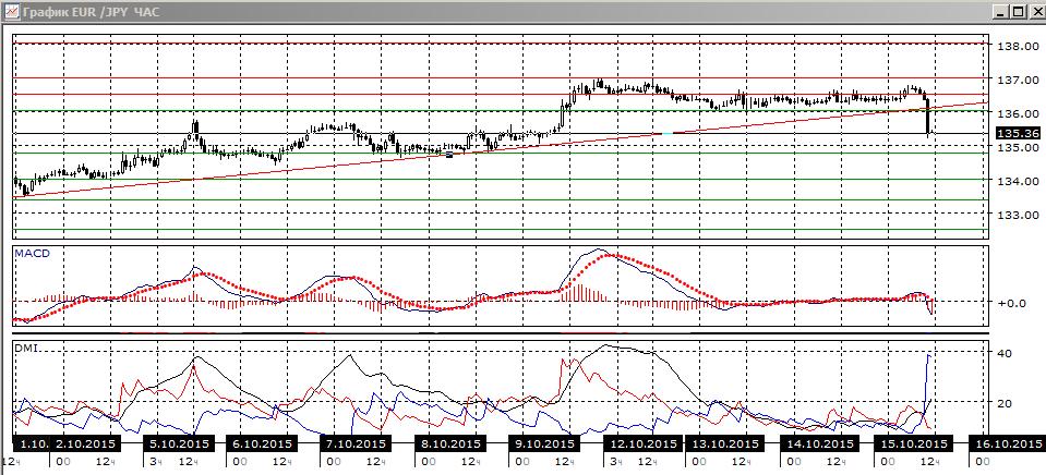 На четырёхчасовом графике пара перешла к снижению после преодоления уровня поддержки 136,00 и линии тренда с начала октября. По индикаторам направленного снижения пара также перешла к снижению: гистограмма MACD снижается в отрицательной зоне, линия MACD направлена вниз, DM- теперь выше DM+. В ближайшей перспективе снижение, скорее, продолжится, так как импульс вниз, после флэта, был сильным. С целью 134,75. На часовом графике такая же картина.