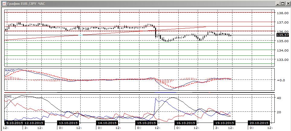 На часовом графике пара консолидируется ниже 136,00. Около этого уровня образовалась двойная вершина, однако перехода к снижению не было. Снижение ниже 135,50 обозначило бы разворот вниз, так как это уровень предыдущего минимума. Целью, исходя из представления о завершении коррекции вверх от 135,00, является этот уровень.