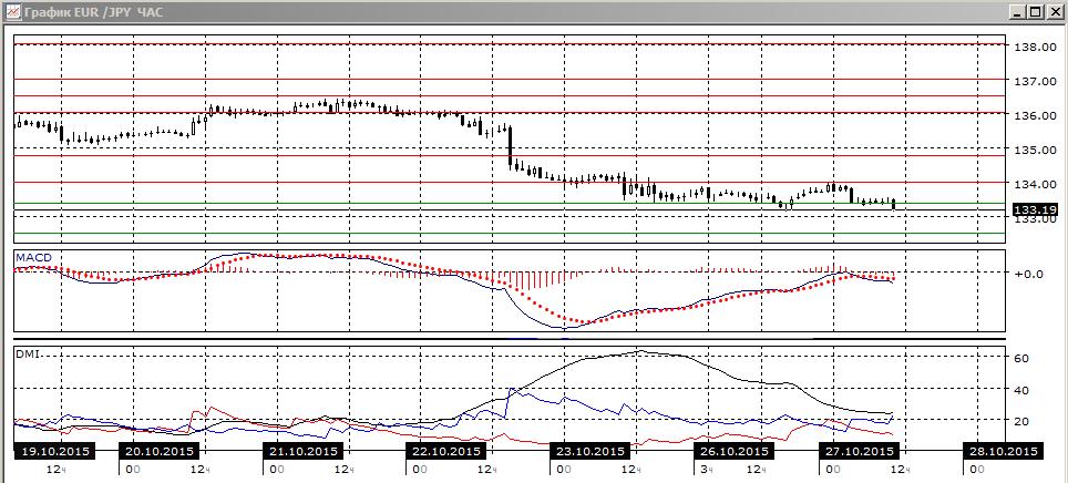 На четырёхчасовом графике пара почти достигла исходной точки коррекции вверх, а если учесть, что коррекция была от 133,4 — уже достигла. Тенденция сильная, отскок бы небольшим и кратковременным. Скорее, снижение пары продолжится. Образование бычьего расхождения минимумов пары и гистограммы MACD не привело к развороту. По ADX тенденция снижения очень сильная.