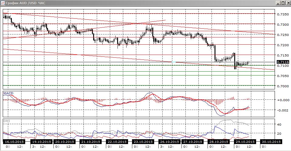 На четырёхчасовом графике коррекция вверх после приближения к 0,7100, достигнувшая 0,7150, завершилась и пара вернулась к 0,7100. Однако этот уровень пока не преодолён, и на возобновление снижение стоит рассчитывать при снижении ниже этого уровня. Тенденция снижения сохраняется, относительные максимумы пары последовательно снижаются, по ADX тенденция снижения хорошо видна — DM+ значительно выше DM-.На часовом графике пара консолидируется в узком диапазоне выше 0,7100. Это похоже выродившееся в остановку перед уровнем поддержки коррекционное движение. Исходя из того, что снижение сильное и признаков разворота тенденции пока нет, предпочтительным выглядит продолжение снижения пары.