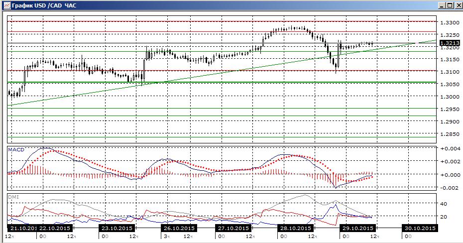 На четырёхчасовом графике ситуация выглядит уже не такой определённой. Снижение 28 сентября привело к преодолению предыдущего относительного минимума и тестированию уровня поддержки 1,3100. После этого пара выросла, и вновь вернулась выше краткосрочного восходящего тренда с 15 октября. По индикаторам направленного движения пара перешла к снижению: DM- выше DM+, гистограмма MACD снижается в отрицательной зоне, линия MACD направлена вниз. Это, при сохранении тенденции роста по треду, делает ситуацию противоречивой и скорее говорит в пользу предпочтительности ожидания развития событий.