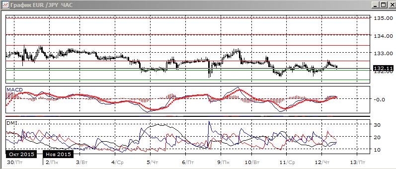 На дневном графике пара осталась между определившихся уровней поддержки и сопротивления — 132,00 и 132,50. Так как попытка выхода выше не имела успеха, продолжение снижения предпочтительно. Последовательность снижения относительных максимумов пары сохраняется, однако новый минимум не был установлен. Ранее образовалось бычье расхождение минимумов пары и гистограммы MACD, что создаёт вероятность разворота. По ADX снижение остаётся сильной тенденцией — превышение DM- над DM+ большое, ADX растёт.