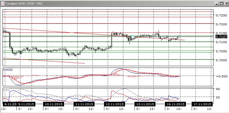 На часовом графике такая же картина — консолидация в границах 0,7100-0,7150. В рамках движения в канале стоит ожидать роста к верхней границе 0,7150. Дальнейшее движение скорее будет в направлении выхода пары из консолидации, выход верх предпочтителен, так как это — направление предыдущего движения, но до закрепления выше 0,7150 на рост выше 0,7150 рассчитывать не стоит.