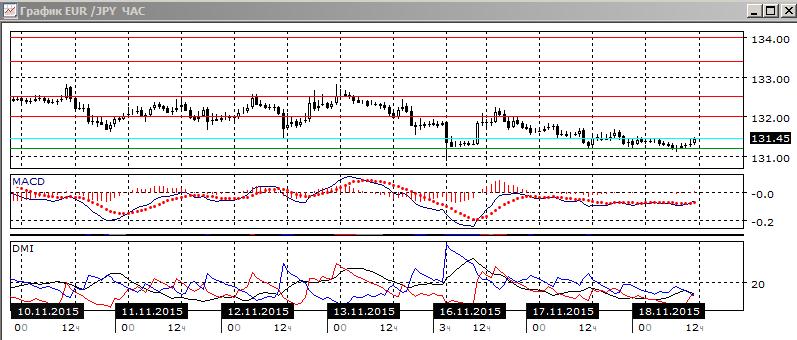 На часовом графике пара достигла уровня минимумов 16-17 ноября на 131,20. Относительные максимумы пары снижаются, и скорее этот уровень поддержки будет преодолён, однако пока лучше дождаться, когда это произойдёт.