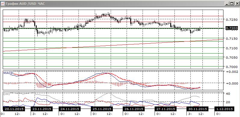 На четырехчасовом графике пара снижается, сопротивлением после разворота от 0,7265, стал сначала уровень 0,7235, а далее 0,7200 (в понедельник). Если уровень 0,7200 будет преодолён, открывается дорога к 0,7235 как ближайшей цели и далее 0,7265 как исходной точке коррекции вниз. Если же пара продолжит снижение от 0,7200, следующим сильным уровнем поддержки сидится 0,7150, рядом также находится краткосрочная линия восходящего тренда с 10 ноября. По ADX, гистограмме MACD, отрицательному наклону линии MACD тенденцией является снижение.
