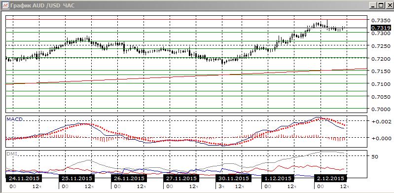 На дневном графике пара вернулась выше уровня 0,7200 и закрытие во вторник было выше 0,7300. Пара выросла несмотря на отсутствие существенного повода — сохранение ставки РБА ожидалось, цены на сырьевые товары, к которым чувствителен австралийский доллар, не выросли. В среду пара не отреагировала ростом на выход положительных данных по изменению ВВП в третьем квартале, что может повлечь за собой коррекцию. Общая тенденция роста, однако, остаётся: пара достигла нового максимума, последовательность роста относительных минимумов и максимумов пары сохраняется, пара остаётся выше линии тренда, предыдущий относительный минимум был преодолён. По ADX тенденцией остаётся рост — превышение DM+ над DM- увеличилось, оно устойчивое. Хотя коррекция кажется возможной, скорее скорее рост продолжится с целью на максимуме октября 0,7385.