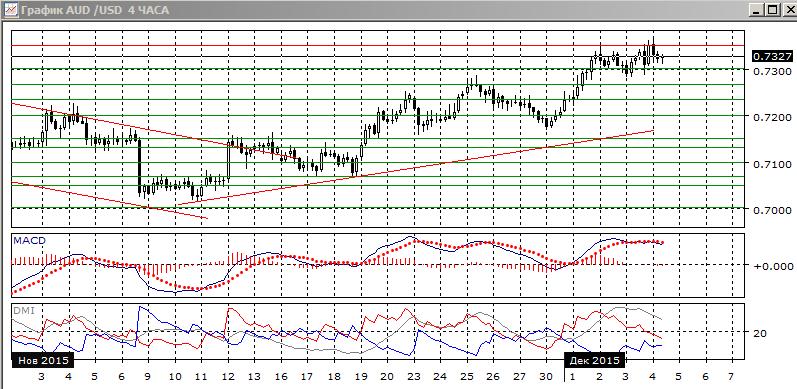 На четырехчасовом графике похожая ситуация: рост замедляется, что видно по уменьшению превышения DM+ над DM-, снижению гистограммы MACD. Однако последовательность роста относительных минимумов и максимумов пары не нарушена, разворота не было. Пара ближе приближается к уровню 0,7350 и он, вероятно, еще раз будет тестироваться. Изменило бы картину снижение ниже 0,7300, в этом случае образовалась бы двойная вершина около 0,7350. Однако пока рост видится предпочтительным.