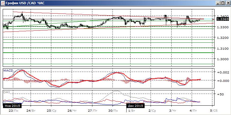 На дневном графике пара ситуация прежняя — пара остаётся в консолидации с центром около 1,3350, треугольник — если рассматривать движение в нём — близок к завершению и скоро должен состояться выход из него. Пара приближается к верхней границе, что соответствует большей вероятности выхода вверх, так как консолидация — это фигура продолжения тенденции, а долговременная тенденция — это рост. По ADX рост остаётся сильной тенденцией - превышение DM+ над DM- большое и устойчивое. Последовательность роста относительных минимумов пары не нарушена. При выходе пары из треугольника вверх ближайшая цель — максимум ноября на 1,3439.