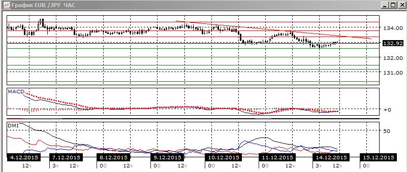 На четырёхчасовом и часовом графиках пара перешла к снижению после преодоления уровня поддержки 133,35. Относительные максимумы пары сейчас снижаются, пара достигает новых минимумов. Уровень 133,00, которого пара достигла снизу, можно считать ближайшим сопротивлением. Тенденция снижения слабая — это видно по околонулевому уровню гистограммы MACD, горизонтальности линии MACD и близости DM+ и DM-. Пока пара ниже 133,№5, снижение кажется предпочтительным. Рядом с этим уровнем проходит также нисходящая линия тренда.