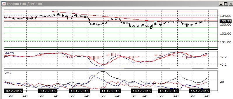 На дневном графике пара осталась выше уровня поддержки 132,60. Несмотря на образование «падающей звезды» во вторник пара в среду выросла до уровня 133,40, который ранее выступал уровнем сопротивления. В целом ситуация коррекции к росту пары сохраняется: более низкого относительного уровня не установлено, по ADX тенденция роста сохраняется — DM+ устойчиво выше DM-, коррекция видна по снижению гистограммы MACD. Пока непонятно, какое влияние окажет решение ФРС на пару, поэтому пока лучше воздержаться. Продолжение роста видится предпочтительным, так как тенденция не изменилась.