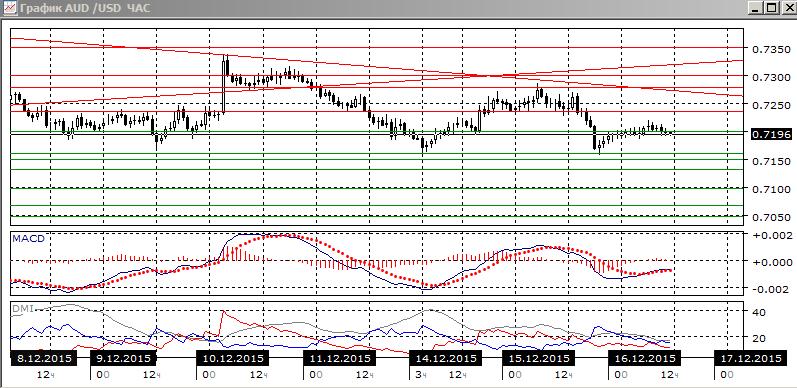 На четырехчасовом графике пара снижается, и откат 15 декабря произошёл при приближении пары к линии тренда. Поддержка была получена на 0,7160, что около предыдущего относительного минимума и уровня поддержки 0,7150. Коррекция от 0,7160 вверх приостановилась на 0,7200. Здесь образуются свечи «дожи». Пара возобновления роста необходимо закрепление выше 0,7200 и далее ближайшей целью становится уровень 0,7250, около линии тренда. Пока же тенденция снижения пары не нарушена, и скорее уровень 0,7260 вновь будет тестироваться.
