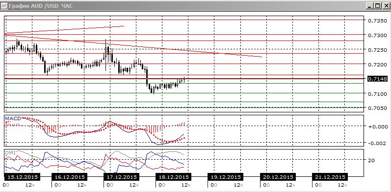 На четырехчасовом графике происходит коррекция к снижению. Рост уже замедляется. Ключевой уровень сопротивления 0,7160. Пока пара ниже этого уровня, предпочтительно новое тестирование уровня 0,7100, если пара преодолеет его, то таким образом вернётся в диапазон 8-17 декабря и целью будет рост до верхней его границы 0,7280. Аналогичная картина на часовом графике — пара растёт, но рост не выходит за пределы коррекционного к к предыдущему снижению.