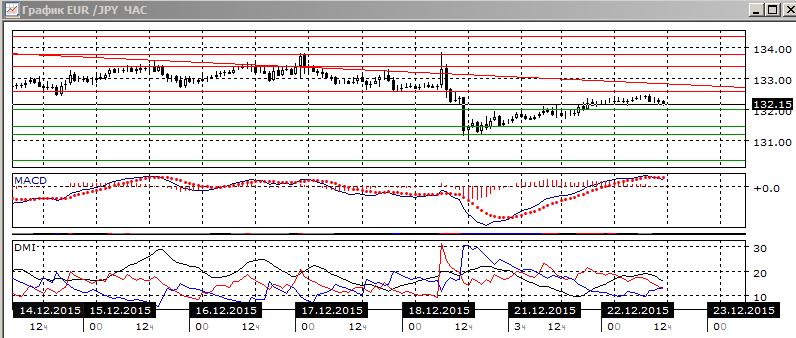 На дневном графике пара преодолела уровень 133,75, при этом был достигнут уровень поддержки 131,45, В понедельник и вторник при коррекции вверх пара остаётся ниже ранее выступавшего уровнем поддержки 132,60 и ниже краткосрочной линии тренда. Пара перешла к снижению: достигаются новые относительные минимумы, относительные максимумы снижаются. По индикаторам направленного движения тенденцией стало снижение: DM- теперь выше DM+, гистограмма MACD продолжает снижение, линия MACD разворачивается. Пока пара ниже краткосрочной линии тренда, целью видится уровень 130,00, на минимумах конца ноября.