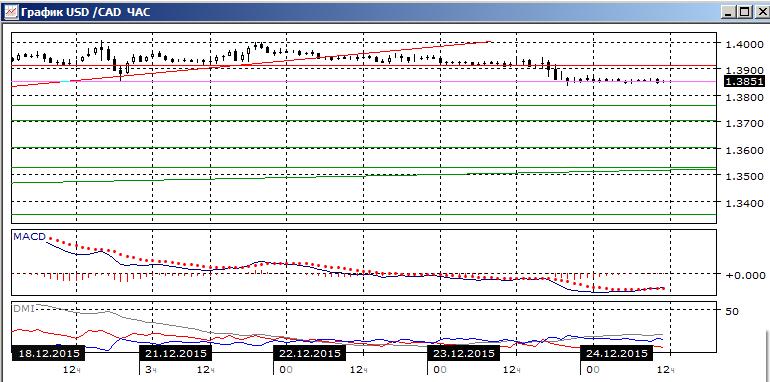 На четырёхчасовом графике пара перешла к снижению: относительные минимумы и максимумы пары снижаются. По индикаторам направленного движения пара также перешла к снижению: DM- теперь выше DM+, гистограмма MACD находится в отрицательной зоне, линия MACD имеет отрицательный наклон. После преодоления уровня поддержки на 1,3910 снижение при остановилось на 1,3850, около этого уровня образуются свечи «дожи». Однако движение вверх не было, что показывает, что рост не поддерживается и преодоление этого уровня видится предпочтительным. Следующей целью за 1,3800 видится 1,3760. На часовом графике пара находится почти на одном уровне немного колеблясь около 1,3850. Более вероятно, что выход из текущей консолидации будет вниз — в направлении предшествующего движения.