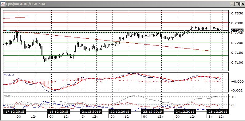 На четырехчасовом графике рост пары приостановился на уровне сопротивления 0,7280. Дальнейшая перспектива, вероятно, определится тем, будет ли преодолён этот уровень сопротивления. Если будет откат ниже 0,7250, то целью видится снижение к следующей сильной поддержке на 0,7200. Если же уровень будет преодолён, то целью видится уровень сопротивления 0,7350, который тестировался в начале декабря. По ADX рост является сильной тенденцией — превышение DM+ над DM- большое, ADX на высоком уровне и растёт. Осложняет преодоление уровня 0,7280 образование медвежьего расхождения максимумов пары и гистограммы MACD.