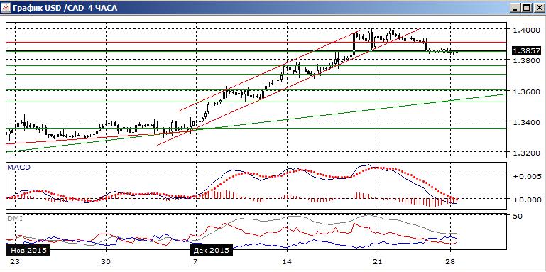 На четырёхчасовом графике движение приостановилось около уровня 1,3850. Рост от этого уровня поддержки не было, поэтому возобновление снижения видится предпочтительным. Относительные максимумы пары после 1,4000 снижаются. По индикаторам направленного движения тенденцией является снижение: DM- выше DM+, гистограмма MACD находится в отрицательной зоне, линия MACD имеет отрицательный наклон. Предпочтительным видится возобновления снижения от 1,3860 к уровню поддержки на 1,3760