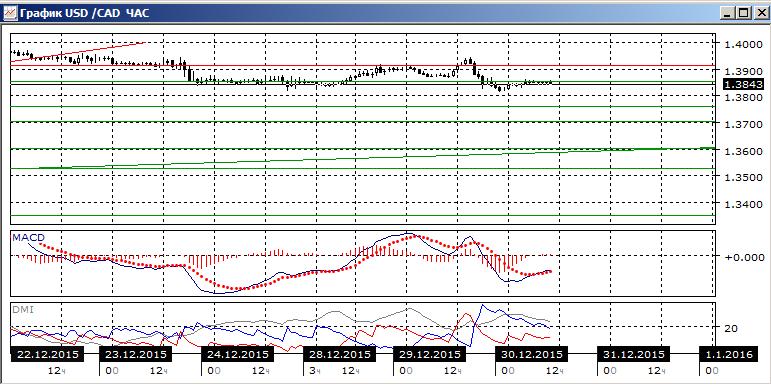 На четырёхчасовом графике пара, после коррекции вверх от 1,3850, не преодолела уровень сопротивления 1,3910 и достигла предыдущего минимума. По индикаторам направленного движения тенденции нет: DM- и DM+ близки, гистограмма MACD около нуля. Исходя из завершения коррекционного движения вверх (пара достигла исходной точки коррекции), продолжение снижения видится предпочтительным.