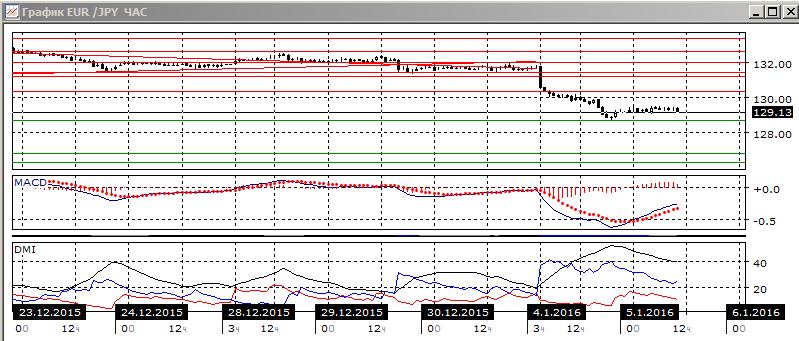 На четырёхчасовом графике относительный минимум образовался около 128,70, от этого уровня происходит небольшое коррекционное движение вниз. Однако скорее всего снижение будет продолжено — оно является сильной тенденцией, что хорошо видно по ADX — разрыв между DM- и DM+ большой и увеличился. Последовательности снижения относительных максимумов и минимумов пары не нарушена. На часовом графике видно, что отскок от 128,70 приостановился. Образуются свечи «дожи», что говорит о неопределённости краткосрочной перспективы. Предпочтительным видится продолжение снижения, так как это долговременная тенденция, и переход к росту не поддерживается.