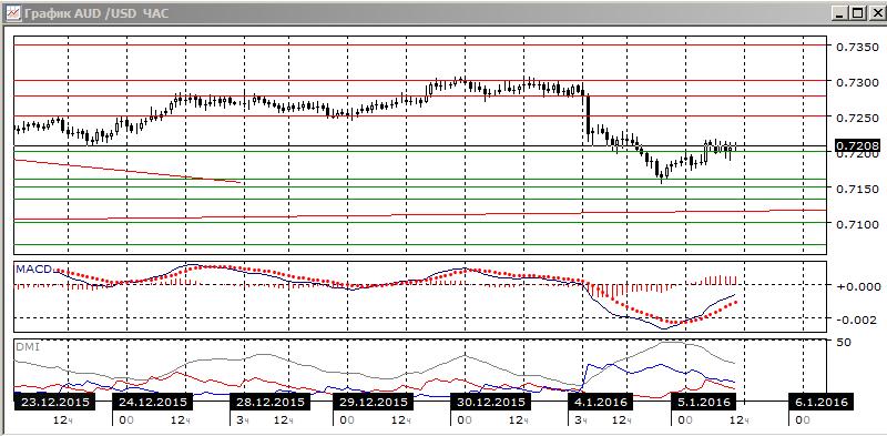 На четырехчасовом графике пара перешла к снижению — движение от 0,7300 до 0,7160 было быстрым, разворот тенденции явным. В краткосрочной перспективе поэтому продолжение снижения видится предпочтительным. По ADX снижение является сильной тенденцией — превышение DM- над DM+ большое. Гистограмма MACD находится в отрицательной зоне, хотя и растёт из-за коррекционного движения от 0,7160. Линия MACD имеет отрицательный наклон. Если пара снизится ниже 0,7200, скорее будет новое тестирование уровня 0,7160.