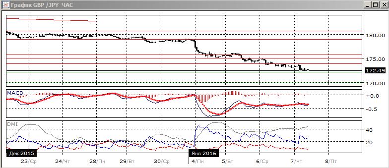 На дневном графике в целом картина не изменилась: пара достигла нового минимума. Был преодолён минимум года и уровень поддержки апреля на 175,80. Сейчас целью можно рассматривать уровень 169,90 — это важный уровень поддержки, так как он ограничивал снижение с апреля по октябрь 2014 г. Пара остаётся ниже линии нисходящего тренда, тенденция по ADX продолжает усиливаться, по гистограмме MACD достигнут новый минимум, тем самым бычьего расхождения уже нет. Скорее, снижение будет продолжаться, так как тенденция очень сильная, а важный уровень поддержки на предыдущем годовом минимуме был преодолён.
