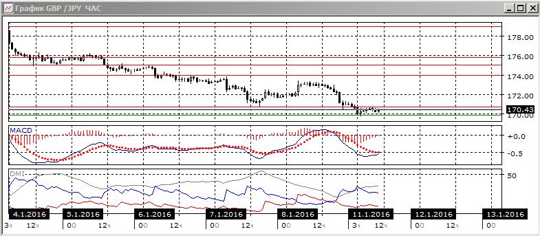На дневном графике в целом картина не изменилась: пара достигла нового минимума. Тестируется уровень поддержки 169,90 — этот уровень снижение с апреля по октябрь 2014 г. Пара остаётся ниже линии нисходящего тренда, тенденция по ADX продолжает усиливаться, ADX растёт, по гистограмме MACD достигнут новый минимум. Скорее, снижение будет продолжаться, так как тенденция очень сильная, но от 169,90 возможен отскок, так этот уровень поддержки обоснован, а снижение от 186, до 170 продолжалось без коррекционных движений. Коррекция назрела, но против тенденции идти опасно.