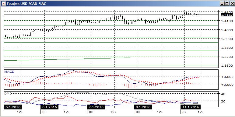 На часовом графике видно, что ниже 1,4200 образуются свечи «дожи», это показывает неопределённость. По ADX тенденция в этом масштабе слабая. Закрепления выше относительных максимумов 7 января не произошло. До преодоления уровня 1,4200 на рост рассчитывать не стоит, так как откат от этого уровня видится реальным.