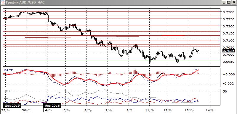На четырехчасовом графике коррекция вверх не была развита и пара ограничивается уровнем 0,7050. Около 0,6950 образовалось два относительных минимума. В рамках движения между определившимися уровнями предпочтительным выглядит продолжение снижения пары до 0,6950, после снижения от 0,7050. На часовом графике движение уже больше похоже на флэт в границах 0,6950-0,7050. Так как пара достигла верхней границы, продолжения снижения к нижней границе выглядит предпочтительным.