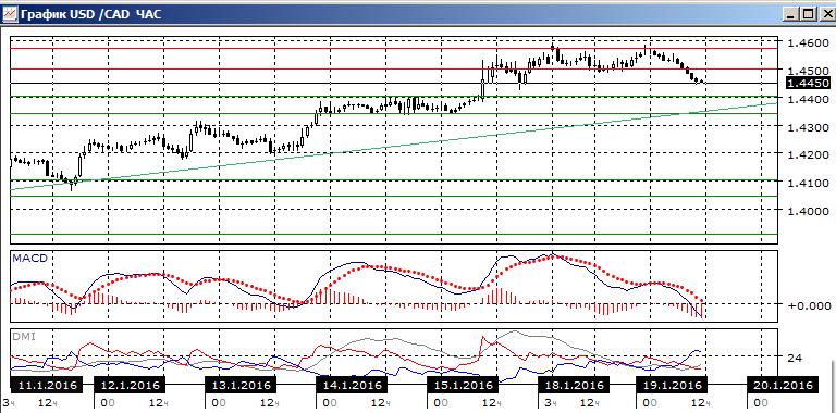 На четырёхчасовом графике пара перешла к снижению — пара снизилась ниже предыдущего относительного минимума, относительный максимум также был ниже предыдущего. Ближайшим уровнем поддержки видится 1,4400. Более краткосрочная линия восходящего тренда — около 1,4340. По индикаторам направленного движения — ситуация коррекции к росту: гистограмма MACD снижается в отрицательной зоне, линия MACD развернулась, но превышение DM+ над DM- сохраняется. Скорее, в ближайшей перспективе снижение продолжится с целью на 1,4400.
