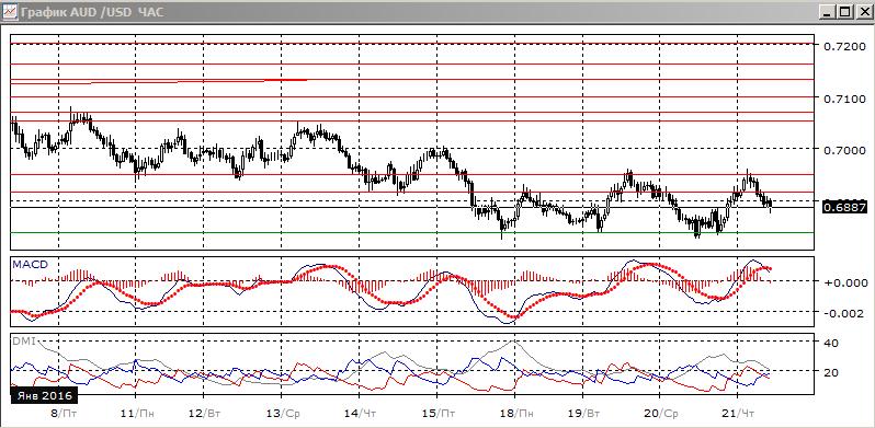 На дневном графике пара остаётся выше поддержки на 0,6840, но ниже сопротивления на 0,6950. разворота не было, тенденцией остаётся снижение. Относительные максимумы и минимумы пары снижаются, по ADX снижение является сильной тенденцией (превышение DM- над DM+ большое и устойчивое, гистограмма MACD остаётся в отрицательной зоне, линия MACD сохраняет отрицательный наклон.