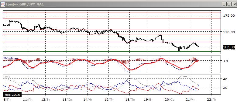 На дневном графике в целом картина не изменилась: пара в пятницу достигла нового минимума 163,96, что ниже уровня поддержки предыдущих дней на 166,90. В четверг этот уровень выступил уже сопротивлением. Пара остаётся ниже линии нисходящего тренда, тенденция по снижения по ADX сильная, ADX растёт. Вновь образовалось бычье расхождение минимумов пары и гистограммы MACD, однако пока признаков разворота нет. Так как близких обоснованных уровней поддержки для пары нет, то дальнейшее снижение облегчается.