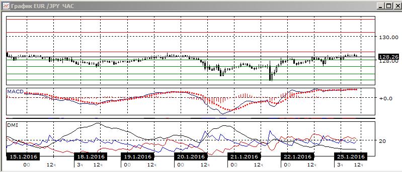 На четырёхчасовом графике происходит рост от нижней границы диапазона, целью видится верхняя граница 128,70, этот уровень уже близко. Дальнейший рост требует выхода пары за границу диапазона, поэтом рассчитывать на него пока неоправданно. Неготовность пары преодолевать уровень 128,70 видна и на часовом графике: тенденция роста в этом масштабе есть, относительные максимумы и минимумы пары растут, но тенденция ослабляется: гистограмма MACD на околонулевом уровне, линия MACD почти горизонтальна, образовалось медвежье расхождение максимумов пары и гистограммы MACD.