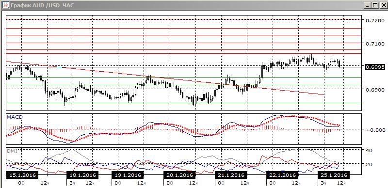 На четырехчасовом графике пара перешла к росту: относительные минимумы пары растут, преодолены несколько вариантов линии нисходящего тренда. Уровень 0,7000 уже выступает в качестве поддержки для пары, поэтому пока пара выше 0,7000 продолжение роста в краткосрочной перспективе видится предпочтительным. Темп роста, однако, замедляется — это видно по снижению гистограммы MACD. Если уровень поддержки 0,7000 будет преодолён и пара снизится ниже него, то это открыло бы дорогу к 0,6950, около максимумов 19 и 21 января.