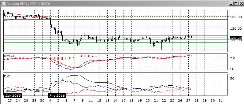 На дневном графике пара достигла верхней границы диапазона 126,80-128,70 и находится немного ниже неё. Закрытие выше показало бы изменение тенденции и перспективу роста к 131,45 в ближайшей перспективе. В остальном ситуация прежняя: по ADX тенденцией остаётся снижение: DM- значительно выше DM+, ADX на высоком уровне, коррекционное движение вверх видно по росту гистограммы MACD и развороту линии MACD. Если будет откат от 128,70 вниз, то в рамках движения в диапазоне предпочтительным станет снижение до нижней границы 126,80.
