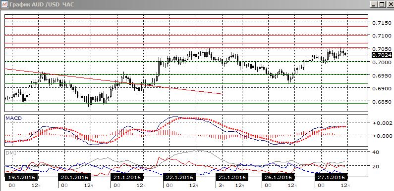 На часовом графике пара растёт, относительные максимумы и минимумы растут от 0,6915, темп роста замедляется при приближении к уровню 0,7050, это видно по снижению гистограммы MACD, хотя она остаётся в положительной зоне. По ADX тенденцией стал рост. Предпочтительным видится продолжение роста, но только после преодоления уровня 0,7050.