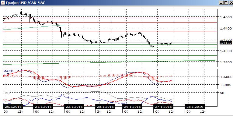 На четырёхчасовом графике происходит рост после достижения уровня поддержки 1,4050. Отскок от него слабый, последовательность снижения относительных максимумов и минимумов пары не нарушена. Скорее стоит ждать возобновления снижения и нового тестирования уровня 1,4050. Превышение DM- над DM+ сохраняется.