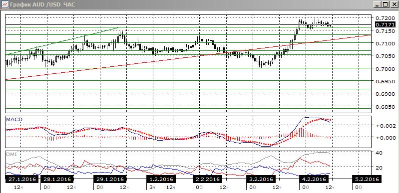 На четырёхчасовом графике пара перешла к росту, который приостановился ниже 0,7200, уровень 0,7160 выступает ближайшей поддержкой. По индикаторам направленного движения тенденцией является рост, превышение DM+ над DM- большое, MACD растёт в положительной зоне, линия MACD имеет положительный наклон. Текущую остановку можно рассматривать как неудавшуюся пока коррекцию, что может говорить о сильной поддержке для пары, так как снижение не находит поддержки. Исходя из этого рост, скорее, будет продолжаться. Преодолённое сопротивление на 0,7130 можно рассматривать теперь как уровень поддержки.
