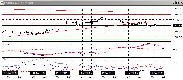 На дневном графике пара снизилась ниже линии краткосрочного восходящего тренда. Последовательность роста относительных максимумов и минимумов пары, однако, не нарушена, около 170,00 (там была остановка перед ростом пары) можно ожидать поддержки. Пока рост до линии долгосрочного тренда с ноября видится предпочтительным.