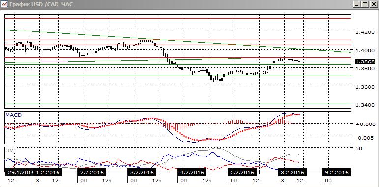 На четырёхчасовом графике рост пары приостановился с приближением к 1,3910, от этого уровня, возможно, начинается разворот. По ADX тенденцией остаётся снижение. При остановка роста была около линии долгосрочного тренда. Так как недалеко и линия краткосрочного нисходящего тренда, то в целом возобновление снижения выглядит предпочтительным, с новым тестированием уровня 1,3720. На часовом графике начало разворота вниз уже видно.