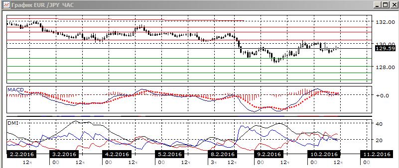 На дневном графике пара получила поддержку на 128,70 — уровне максимумов в январе, что является ближайшей обоснованной поддержкой для пары. Последовательность снижения относительных максимумов и минимумов пары продолжается. По индикаторам направленного движения пара переходит к снижению: DM- выше DM+, гистограмма MACD снижается и достигла нулевого уровня, линия MACD уменьшает положительный наклон. «Хвосты» выше 128,70 показывают, что поддержка на этом уровне имеется и возможен переход к росту до линии тренда, но пока тенденцией остаётся снижение и, скорее, оно продолжится за счёт укрепления иены, которая преодолела долговременную зону сопротивления против доллара.