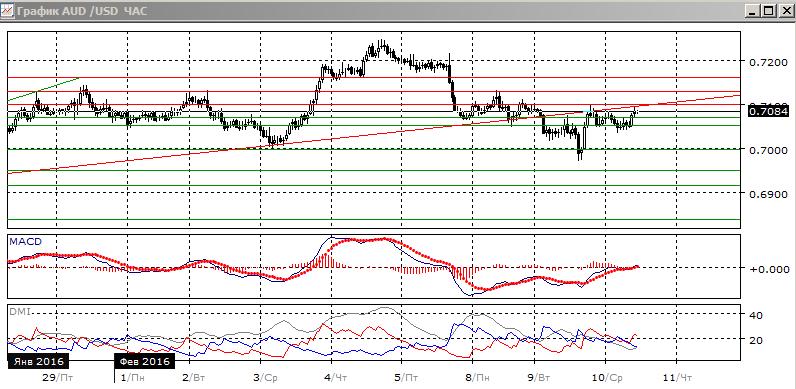 На часовом графике пара достигла сильного уровня сопротивления на 0,7100. До его преодоления рассчитывать на рост пары излишне рискованно, хотя переход к росту от 0,7000 в виден. Закрепление выше 0,7100 стало бы преодолением линии шеи в обратной фигуре голова-плечи с головой на 0,7000.