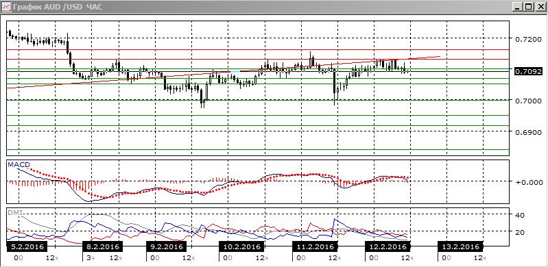 На четырёхчасовом графике виден образовавшийся на 0,7000 четвёртый минимум, а также новый максимум на 0,7130. Исходя из движения в канале между этими уровнями, предпочтительным было бы снижение до нижней границы 0,7000. Пара продолжает находиться близко к линии тренда с 20 января ниже него. Ближайшая поддержка находится на 0,7100. При закреплении выше 0,7130 и линии тренда развитие роста видится предпочтительным с целью на 0,7250 — около относительного максимума 4 февраля. Снижение пары ниже 0,7000 может стать преодолением линии шеи, так как движение с 27 января можно представить и как модель голова-плечи.
