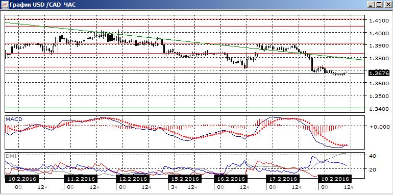 На дневном графике пара почти достигла относительного минимума февраля около 1,3640, и скорее этот уровень будет преодолён. Пара уже ниже уровня поддержки на 1,3720, закрытие было ниже. «Молот» во вторник не был подтверждён, и пар вместо этого снижалась от линии тренда, если её откорректировать. Далее 1,3640 целью видится только уровень 1,3400 — до этого обоснованного уровня поддержки не видно. По индикаторам направленного движения тенденцией является снижение: DM- выше DM+, гистограмма MACD находится в отрицательно зоне, линия MACD имеет отрицательный наклон (хотя он уменьшается). Возможно образование бычьего расхождения минимумов пары и гистограммы MACD, это увеличивает вероятность отскока вверх. Тем не мене, пока пара ниже линии тренда продолжение снижения видится предпочтительным.