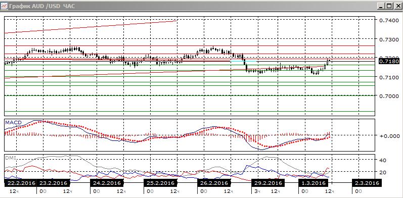 На часовом графике после долгой консолидации выше 0,7130 пара кратковременно преодолела этот уровень, но далее вернулась выше 0,7130 и рост продолжился. Кратковременное снижение можно рассматривать как «ложный пробой» уровня поддержки, исходя из этого, дальнейший рост кажется более предпочтительным.