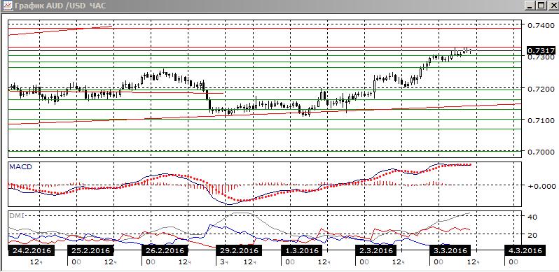 На дневном графике пара продолжила рост от линии восходящего тренда с середины января. Были преодолены относительные максимумы конца февраля на 0,7260. Закрытие с среду было выше этого уровня сопротивления, а также «круглого» уровня 0,7300. Целью сейчас видится уровень максимума декабря на 0,7388. Рост относительных минимумов пары продолжается. Пара по ADX также перешла к росту: DM+ сейчас выше DM-, гистограмма MACD остаётся в положительной зоне, линия MACD сохраняет положительный наклон. Закрытие в среду было выше 200-дневной средней.