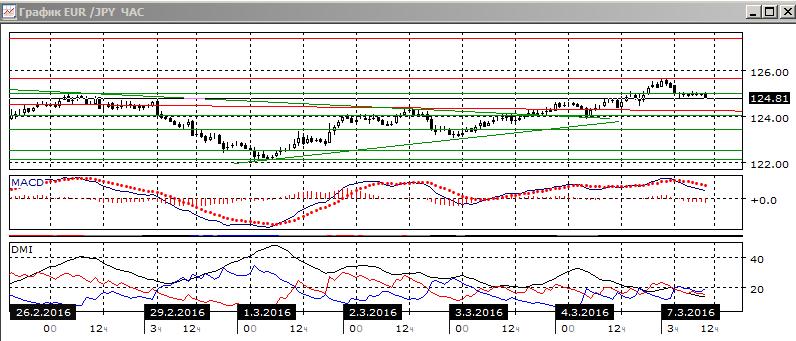 На четырёхчасовом графике пара вышла из треугольника вверх, был преодолён уровень предыдущего относительного максимума около 124,40. Сейчас пара снизилась и получила поддержку на 125,00, около максимума 26 февраля. Относительные минимумы и максимумы пары растут, DM+ выше DM-, гистограмма MACD остаётся в положительной зоне, линия MACD имеет положительный наклон. Скорее, рост продолжится. Сильного сопротивления можно ожидать на 127,40.
