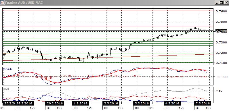 На четырёхчасовом графике происходит небольшой откат. Пока он ограничен уровнем 0,7400 и уровнем поддержки на 0,7385 (сопротивление ранее). Последовательность роста относительных максимумов и минимумов пары не нарушена. По ADX тенденция очень сильная — превышение DM+ над DM- очень большое, ADX находится на высоком уровне и растёт. Образовалось медвежье расхождение максимумов пары и гистограммы MACD, что говорит о замедлении роста пары и увеличении вероятности отката. Учитывая силу тенденции роста, скорее всего он продолжится.